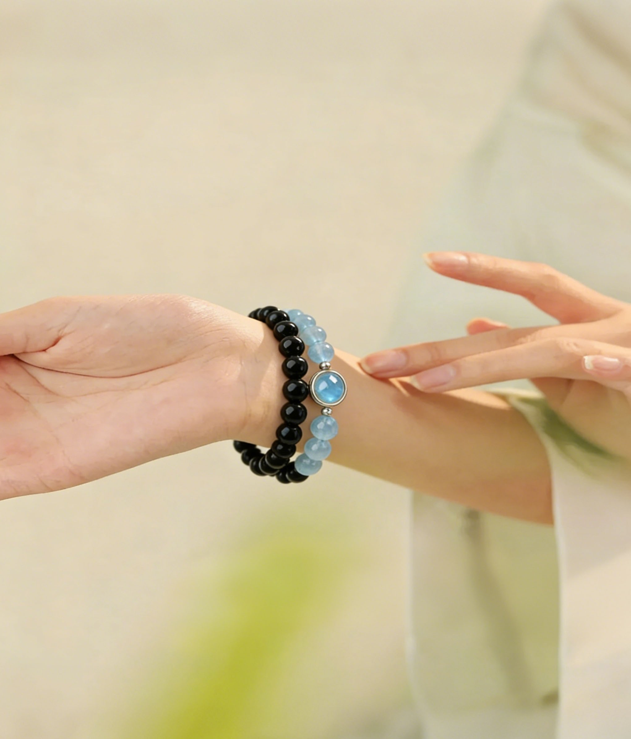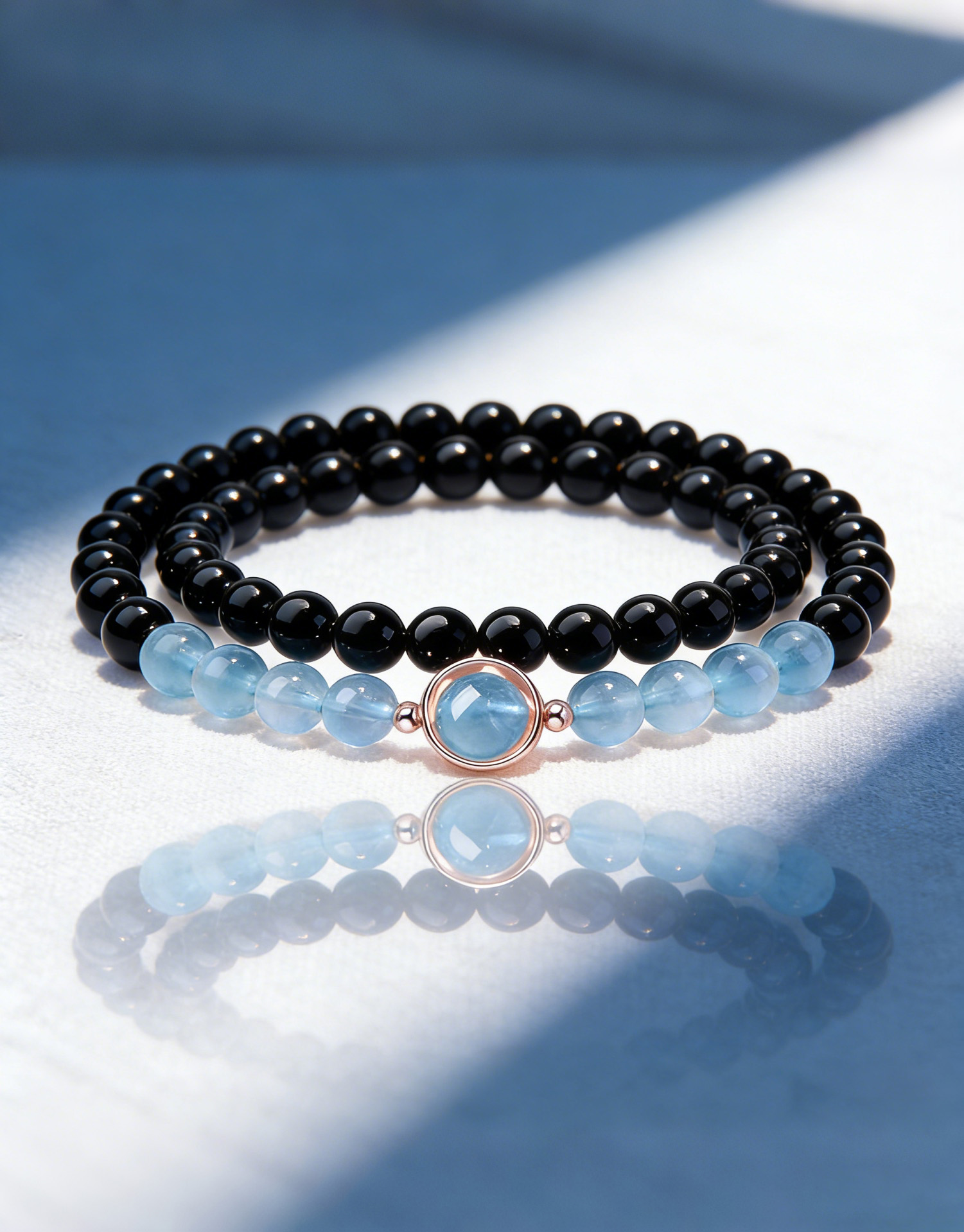 Combines black obsidian for protection and aquamarine for clarity—two stones that balance stability and intuitive shift.