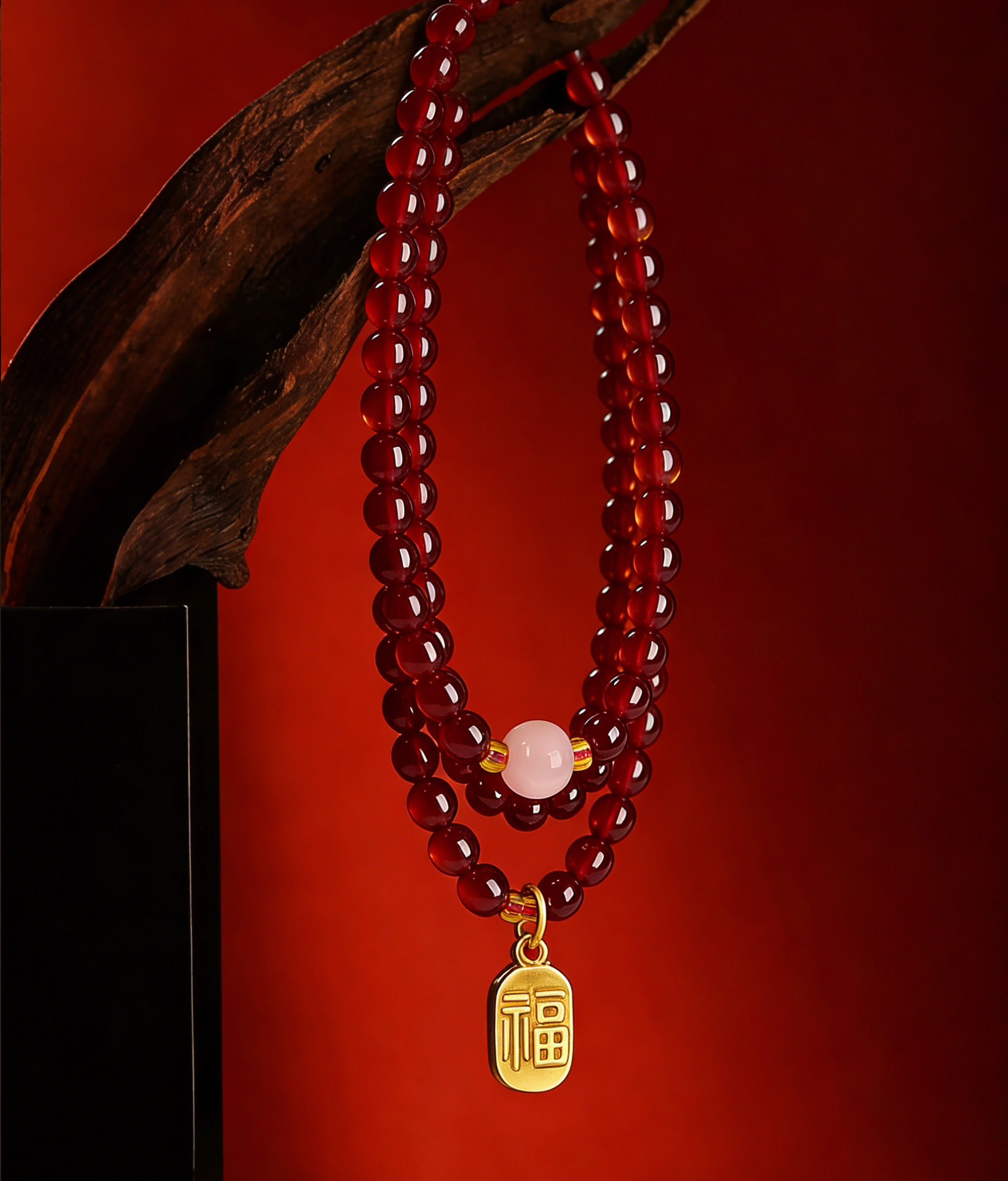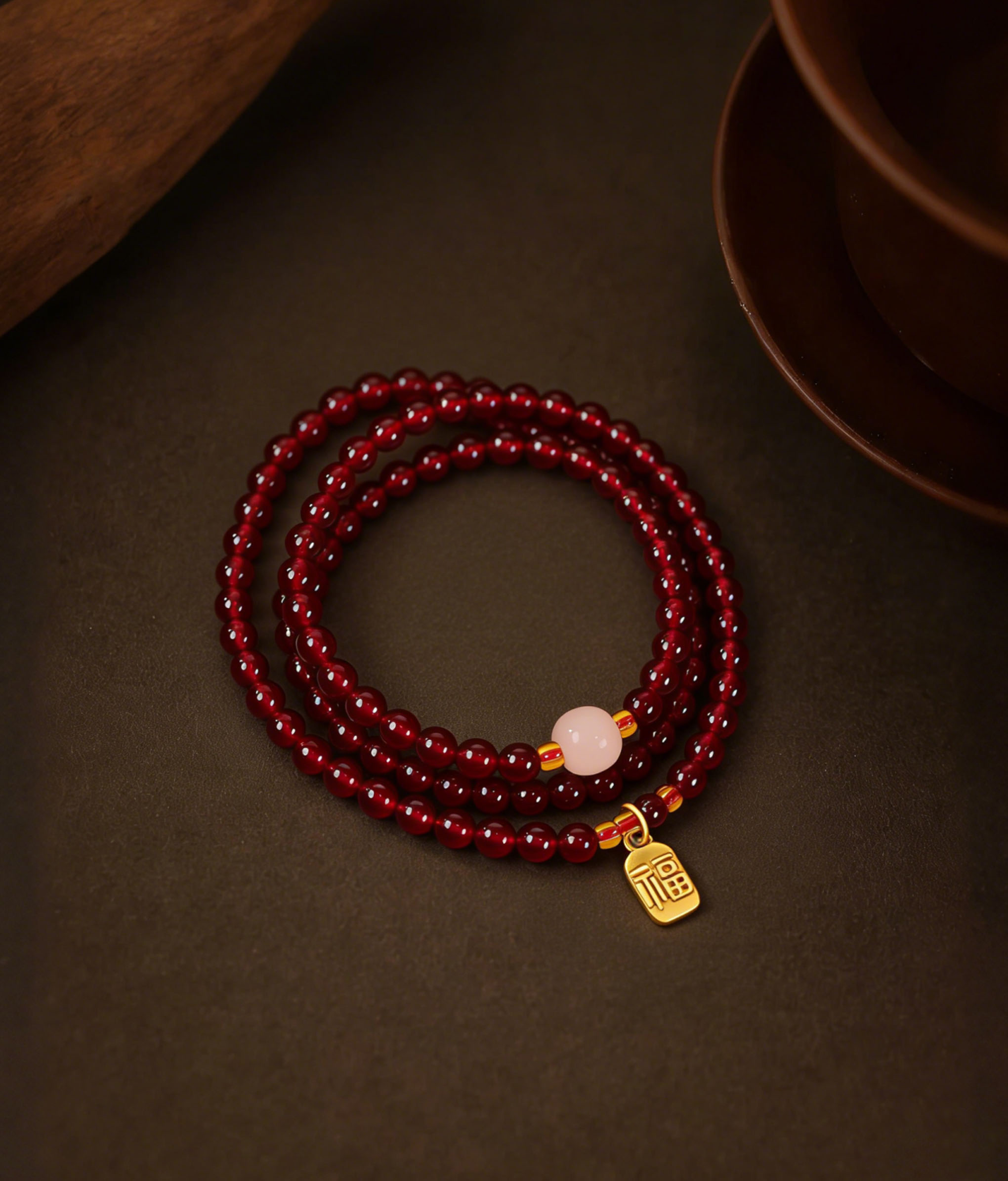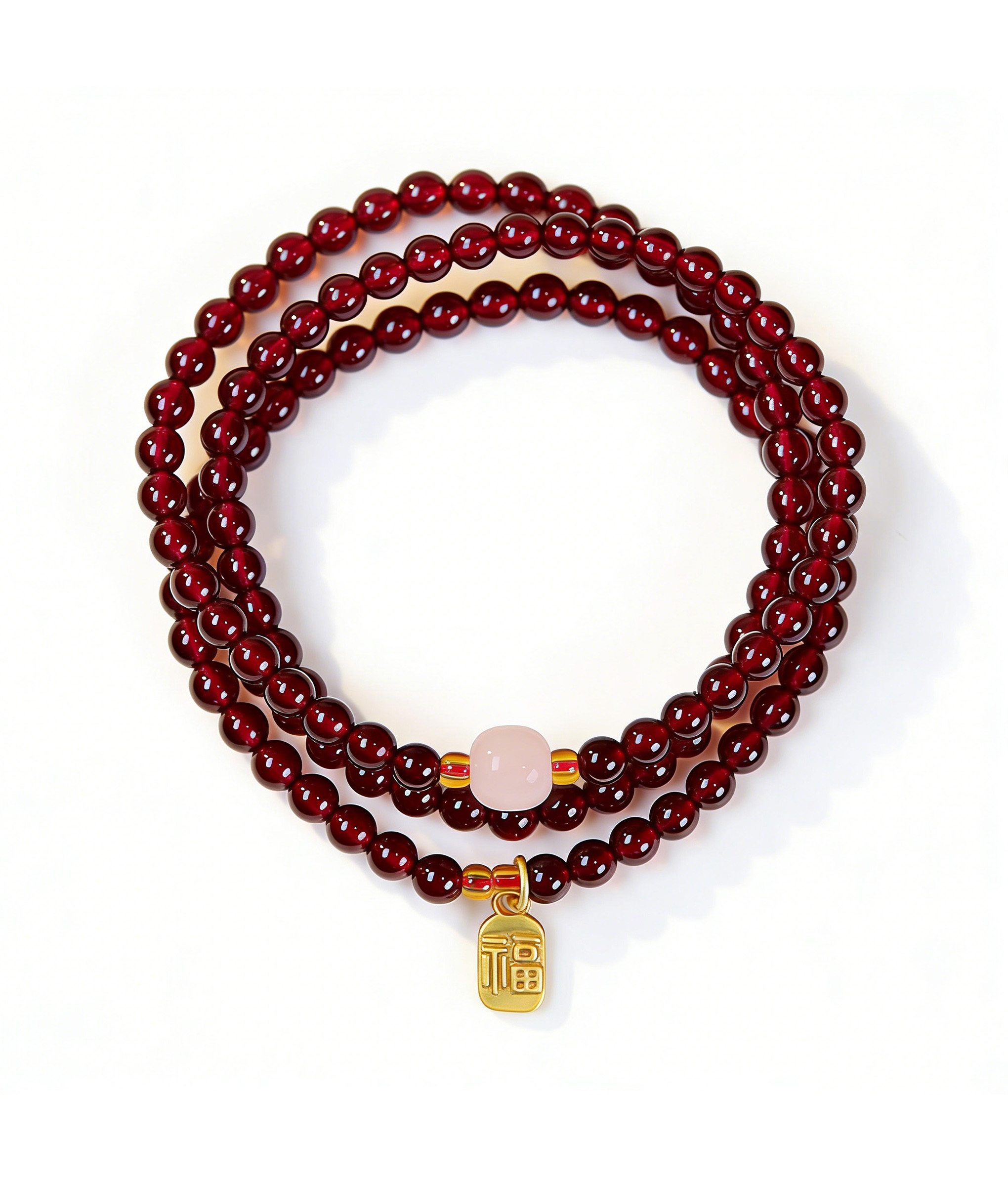 This triple-strand bracelet, crafted from natural garnet and Hetian jade, is a purposeful Feng Shui accessory designed to balance energy and attract positive luck. Garnet is traditionally valued in Feng Shui for its ability to enhance vitality and draw abundance, while Hetian jade adds a calm, harmonizing energy to daily life.